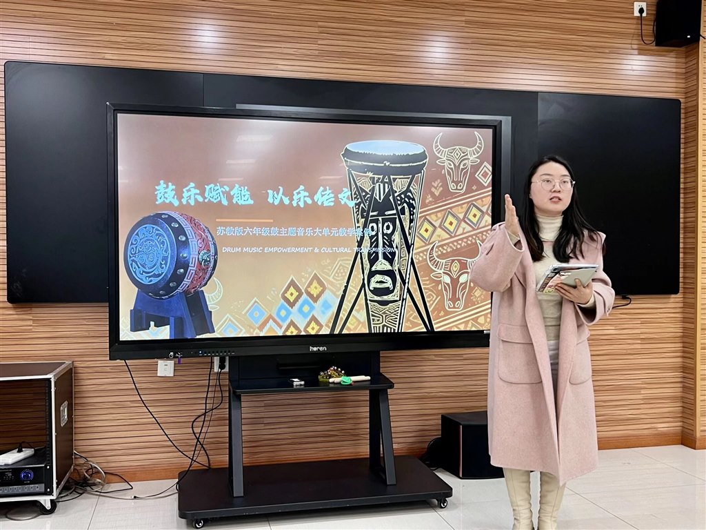 课堂展示结束后,宋丽娜老师围绕教研主题开展《鼓乐赋能,以乐传文》专题分享。讲座以小巴郎童年的太阳为脉络,构思精巧、环节衔接用心,结合 AI 数字教学资源创新打造 AI 手鼓资源,将乐曲欣赏、器乐实操、文化传承自然串联,打通音乐欣赏、器乐学习的知识壁垒,为民族音乐课堂数字化融合教学提供了鲜活可借鉴的实践范例。